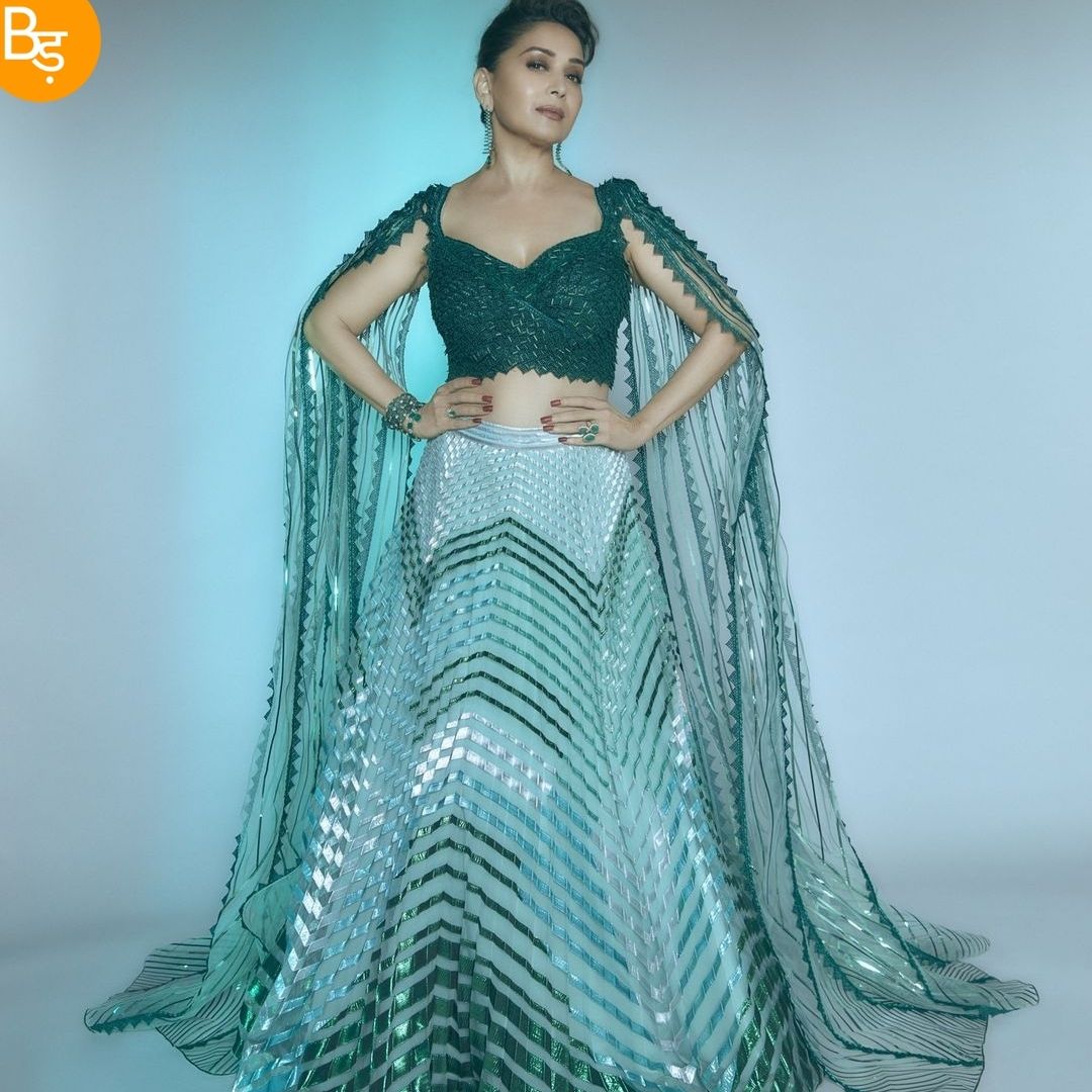 Actor Madhuri Dixit in Green Lehenga is breaking the internet. The seasoned actor is back on the Dance Deewane, dance reality show. She is joining the show as a judge. On the sets of the TV show, Madhuri Dixit decided to wear a fusion green lehenga. The emerald green fusion lehenga created a perfect blend of modern and tradition sentiments. Madhuri Dixit’s emerald green fusion lehenga is designed by the ace designer Amit Aggarwal. He is known for his futuristic fashion and timeless couture. Also Read – Mouni Roy in Bottle Green Lehenga | Worth Rs 2,25,000